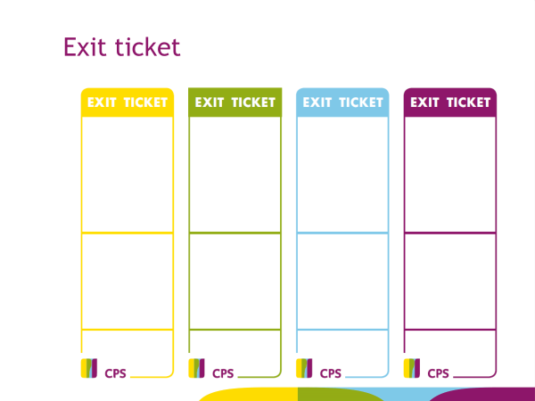 - Ook aan het einde van je les kun je formatief toetsen. Een leuke en handige werkvorm is het gebruik van een exit ticket (zie het voorbeeld hieronder). Op deze kaartjes beantwoorden leerlingen de vraag of vragen die jij formuleert. Denk bijvoorbeeld aan ‘3-2-1’: noem drie dingen die je geleerd hebt in deze les, twee dingen die je nog over dit onderwerp wilt leren en één vraag voor de volgende les. De exit ticket helpt leerlingen te reflecteren. Ze worden steeds meer eigenaar van hun leerproces, doordat ze er zelf aspecten van benoemen, en raken zo gemotiveerd om de leerstof onder de knie te krijgen. Via deze link kun je de exit tickets downloaden om zelf te gebruiken.